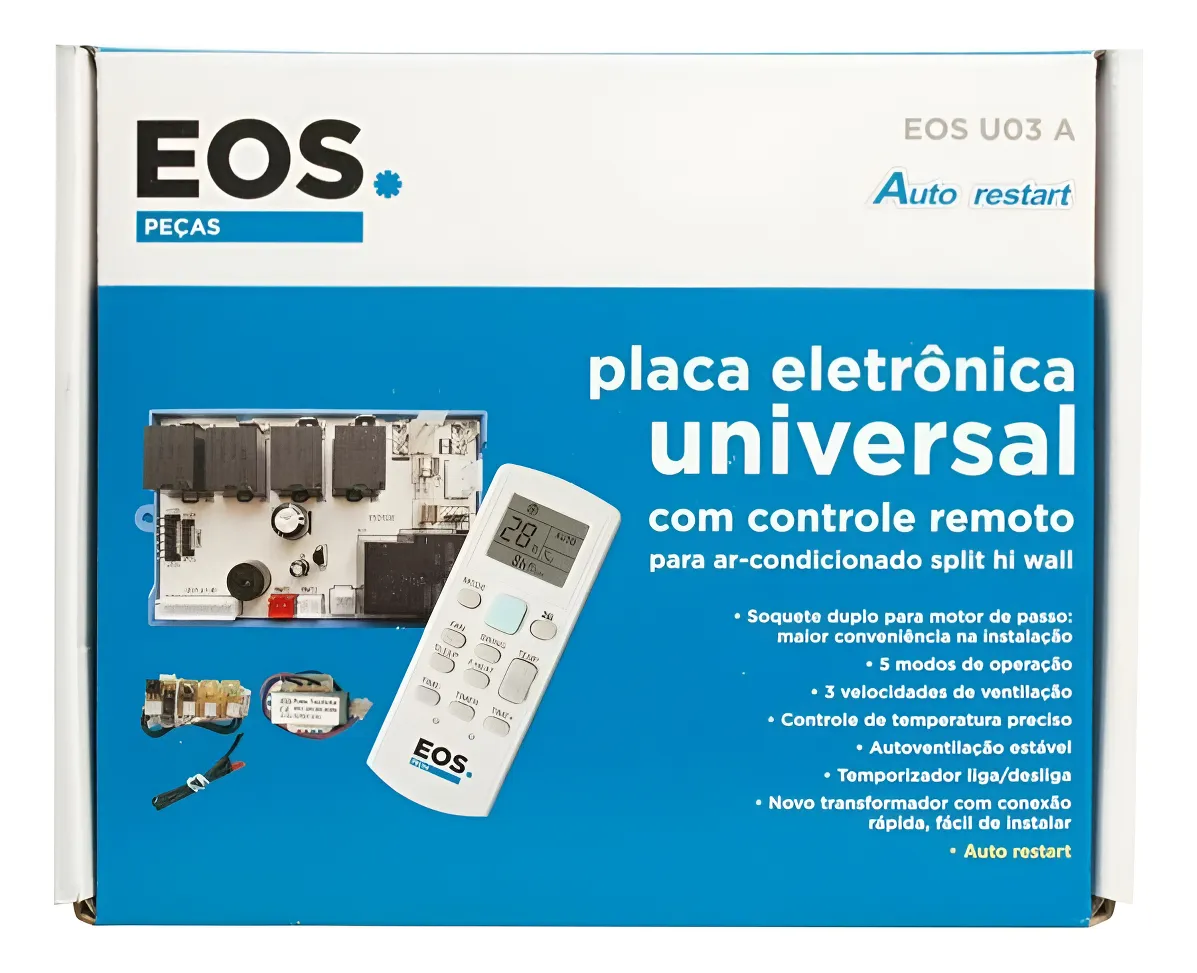 A placa universal EOS-U03A é projetada para atender aparelhos de ar-condicionado do tipo Split Hi-Wall com capacidades que variam de 7.000 a 30.000 BTUs.